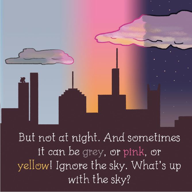 A children’s book for teaching kids all the simple things we know to be true about the world like the sky is blue…except at night or when it’s pink…or yellow.